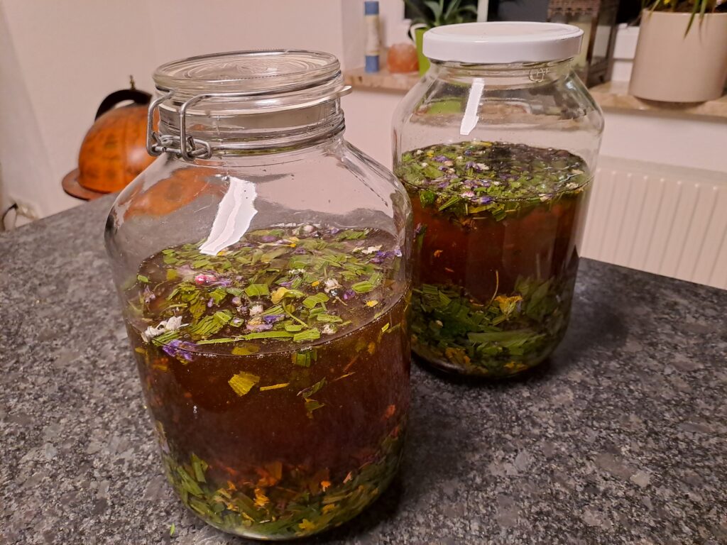 Zubereitung: Glas je nach gewünschter Menge mit flüssigem Bienenhonig füllen und nach und nach mit den verfügbaren Kräuter befüllen. (Es müssen nicht alle Kräuter gefunden werden, es reicht oft schon nur der Spitzwegerich!) Täglich umrühren und nach ungefähr 2 – 3 Monaten bei Zimmertemperatur ziehen lassen. Danach abseien, dunkel und kühl lagern.
